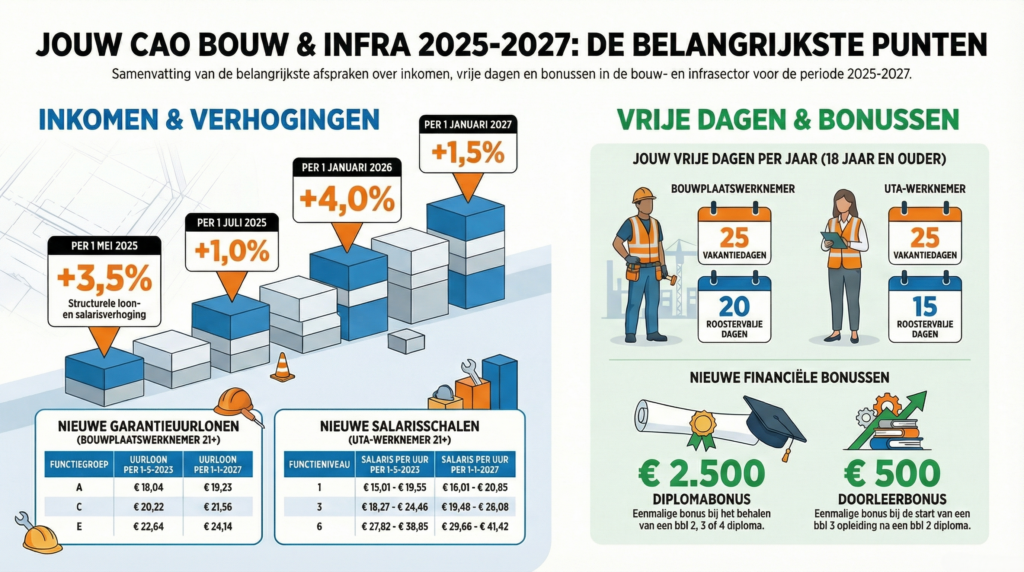 De belangrijkste wijzigingen in de CAO Bouw & Infra 2025-2027 vind je hieronder.